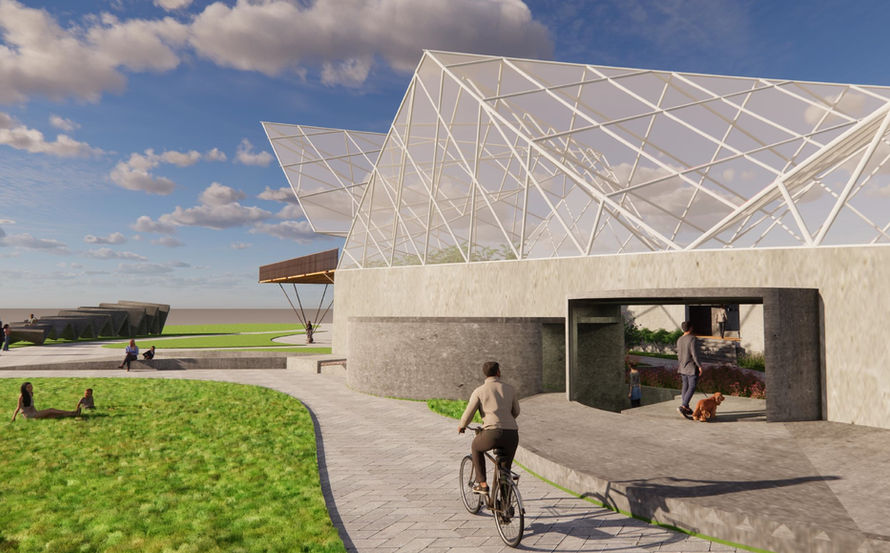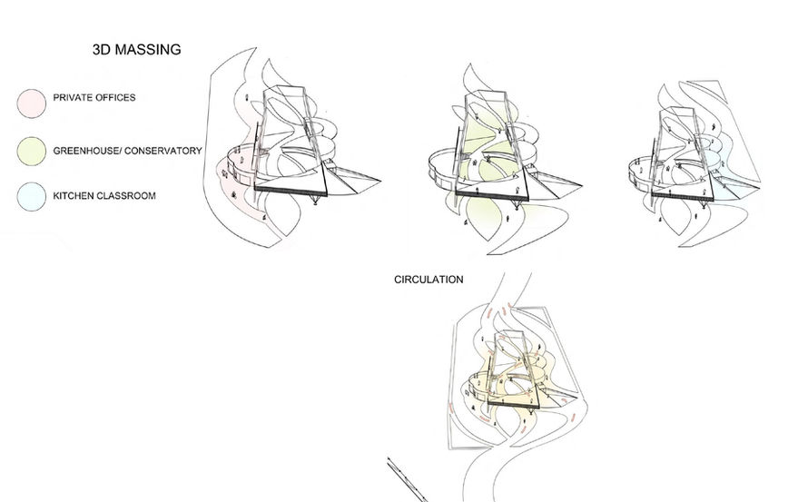 The green corridor gives the public a garden passageway as it diagonally connects the corners of the site. Within this corridor, a greenhouse functions as the main structure. This greenhouse functions as a closed, tight bubble that stores heat and energy so as to develop conditions for life to"thrive"- where the "bubble" can take the form of anything. this greenhouse provides the site with fertile conditions while also educating students by providing them with a kitchen classroom where they learn to cook with the plants and vegetables they nurture. The greenhouse transitions into a conservatory that nurtures flora not commonly found in new jersey, which would be used for research purposes by the liberty state science center.